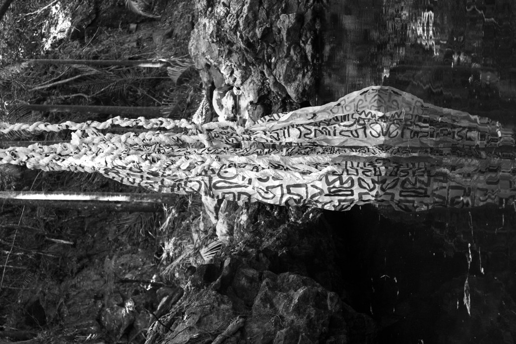 As the work started to evolve, other elements and symbols were introduced. I started painting hundreds of symbols on 10 metre lengths of recycled paper before making the extra large plaits. I made 9 plaits in total which is about 2.7km of my unknown script painted on paper!